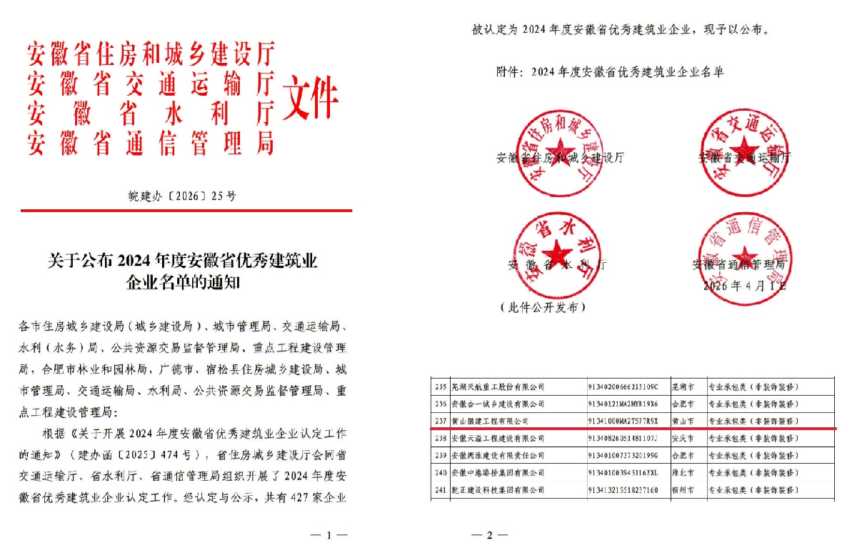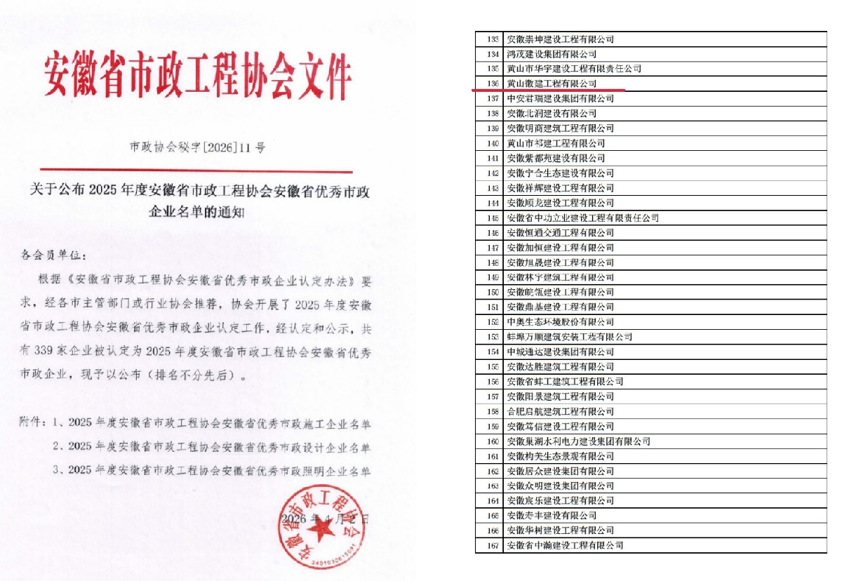 近日,安徽省建筑业领域年度评选结果公布,黄山徽建工程有限公司凭借过硬的综合实力、优质的工程品质和良好的行业口碑,在众多参评企业中脱颖而出,荣膺 “安徽省优秀建筑业企业”“安徽省优秀市政施工企业” 双项省级殊荣,彰显了公司在建筑及市政施工领域的标杆实力。
