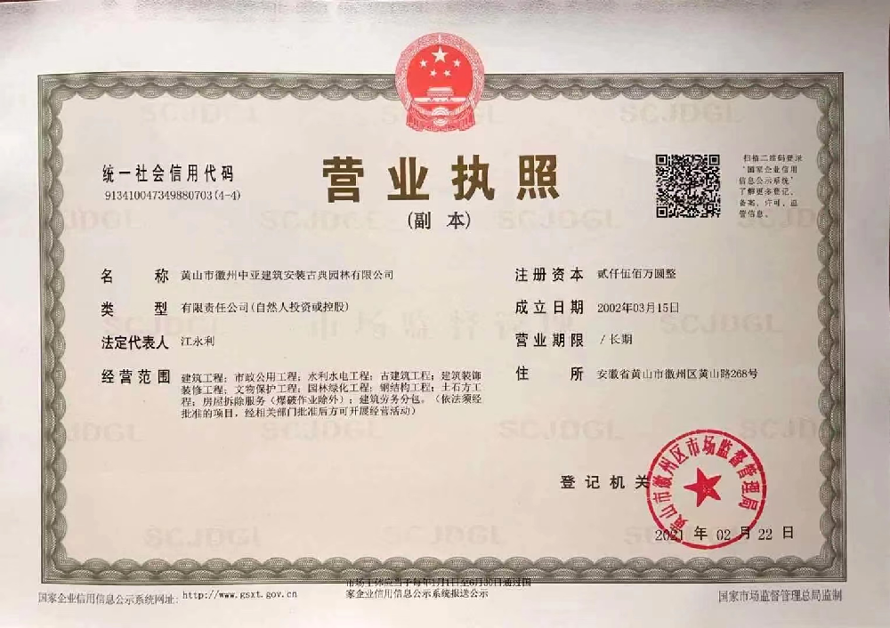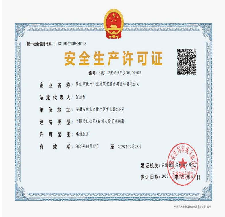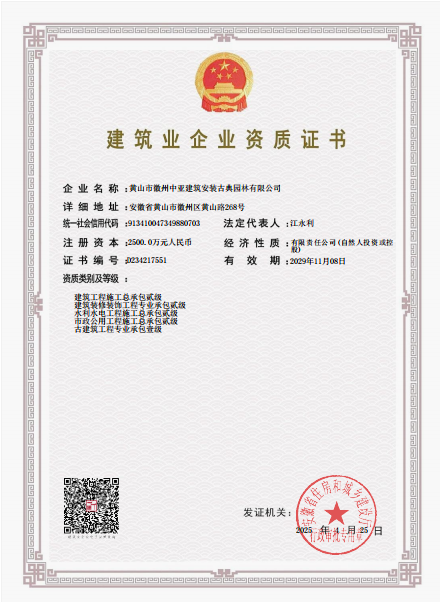 黄山市徽州中亚建筑安装古典园林有限公司拥有工程施工总承包、市政公用工程施工总承包、古建筑工程专业承包、文物保护工程施工、建筑装修装饰施工总承包、水利水电工程施工总承包等多项专业资质。